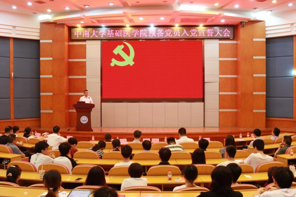 2024年7月1日中午,中南大学基础医PG免费试玩 分党校预备党员培训暨入党宣誓大会在湘雅新校区福庆楼四楼学术报告厅举行,院党委委员、专职组织员、支部书记、54名预备党员、正式党员与入党积极分子代表参加会议。会议由院党委委员胡忠良主持。