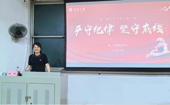 2024年7月2日,基础医PG免费试玩 在湘雅新校区福庆楼T105教室开展“一院一宣讲”党纪学习教育,校纪委第二纪检监察室主任杨帆作题为《严守纪律,坚守底线》的专题宣讲,院领导王慷慨、熊炜、刘俊文、黄河、冯虹、王宽松、周勇和全体教职工参会学习。会议由院党委副书记冯虹主持。
