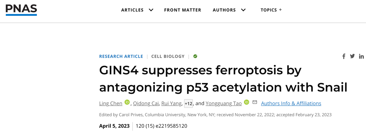 4月5日上述成果在《美国科PG免费试玩 院报》(Proceedings of the National Academy of Sciences of the United States of America,PNAS)在线发表。陶永光研究员以及湘雅医院医学研究中心研究员刘双为本论文的共同通讯作者,中南大学基础医PG免费试玩 肿瘤所实验师陈玲为第一作者。该论文审稿人一致认为,这是一项具有创新性的研究。研究者证实GINS4可作为一种潜在的新型诱导肿瘤细胞铁死亡的靶标,联合针对细胞周期G2/M期的放化疗药物,可增加肿瘤治疗效果。