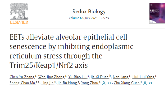 2023年6月2日,中南大学基础医PG免费试玩 管茶香教授团队在国际权威学术期刊《氧化还原生物学》(Redox biology,中科院一区TOP期刊)发表了题为“EETs alleviate alveolar epithelial cell senescence by inhibiting endoplasmic reticulum stress through the Trim25/Keap1/Nrf2 axis(EETs通过Trim25/Keap1/Nrf2轴抑制内质网应激减缓肺泡上皮细胞衰老)”的研究论文。中南大学基础医PG免费试玩 生理学系为第一及通讯作者单位,基础医PG免费试玩 管茶香教授和周勇副教授为本文的共同通讯作者,2020级博士生张晨宇为第一作者。