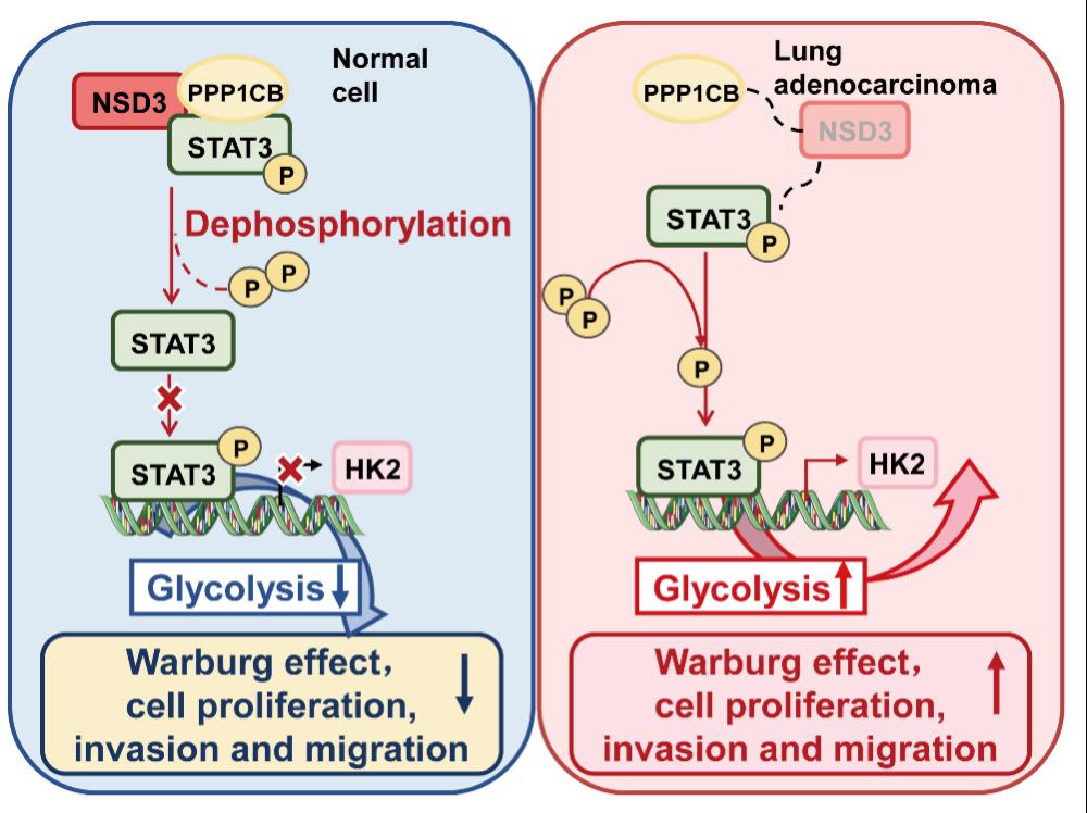在本研究中,陶永光、刘双和石颖团队全面、深入地阐明了NSD3在肺腺癌中的功能。系统的临床样本分析和功能学实验证明,低表达的NSD3与肺腺癌患者不良预后正相关,并且NSD3能抑制肺腺癌的增殖、迁移、侵袭能力。但NSD3调控肺腺癌进展的机制并不明确。通过TCGA数据库以及GEO数据库的生物信息学分析,提示NSD3可能调控肺腺癌的糖酵解进程,并进一步通过葡萄糖消耗量与乳酸生成量测定、RT-qPCR及Western blot等试验证明:NSD3可以通过调控HK2这一糖酵解限速酶的表达影响糖酵解进程。进一步通过免疫共沉淀联合质谱实验,证明NSD3与PPP1CB和p-STAT3能够形成蛋白三聚体,从而刺激PPP1CB对p-STAT3去磷酸化,抑制HK2的转录,最终抑制肺腺癌中的Warburg效应。同时,我们创新性地证明了PPP1CB的去磷酸化酶活性与培养环境中CO2浓度及pH值有关,PPP1CB蛋白中A56P、E183A和D252Y位点的突变能够导致其磷酸酶功能失活。因此,本研究聚焦于NSD3在肺腺癌的发展中的非表观遗传调节作用,并提示NSD3能够成为肺腺癌治疗中的一个潜在靶点。