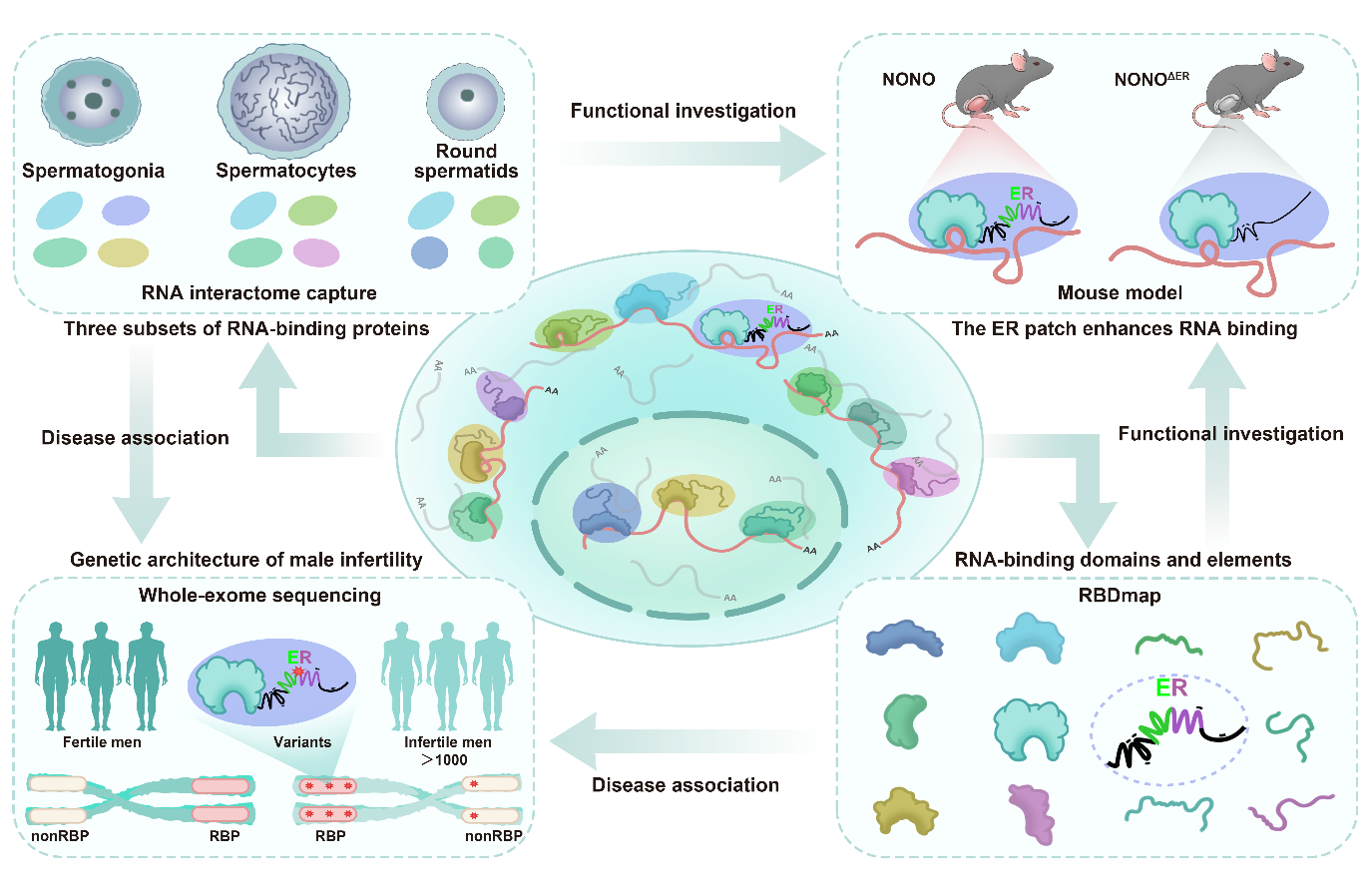 产生结构和功能正常的精子,是所有有性生殖动物繁衍后代的基础。精子在睾丸中发生,并具有进化的保守性。在人类,睾丸内精子发生长达64天,是一个极其复杂而独特的细胞分化和发育过程,受到一组时空特异性表达基因的精密调控。在精子形成过程中,随着精子细胞变形和细胞核的压缩,基因转录活动将逐渐降低直至完全停止,那些为精子细胞后期阶段发育所需的基因都需要提前转录为mRNA,然后通过RNA结合蛋白(RBP)以翻译抑制状态储存在精子细胞中,直到特定发育阶段再被激活翻译。RBP在转录或转录后水平调控基因表达,是非编码RNA调控、相分离等过程中的重要组成元件,是精子发生领域的前沿研究热点。但人们对于RBP如何动态调节精子发生过程中大量RNA缺乏系统性了解,对于RBP的非结构域元件(不在已注释结构域中的短基序)还未得到充分探索。另外,尽管已报道RBP的功能障碍可能与男性不育(一种全球性的主要生殖问题)有关,但其序列突变与男性不育之间的关联也缺乏全基因组水平的认识。