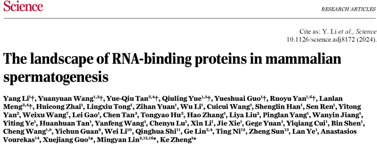 2024年8月30日,中南大学基础医PG免费试玩 生殖与干细胞工程研究所的谭跃球教授课题组,与南京医科大学生殖医学与子代健康全国重点实验室郑科教授和郭雪江教授及南京医科大学基础医PG免费试玩 神经生物学系林明焰副教授合作,在学术期刊《Science》(《科学》)在线发表题为The Landscape of RNA-Binding Proteins in Mammalian Spermatogenesis( “哺乳动物精子发生RNA结合蛋白质全景图谱”)的研究论文(Research Article)。