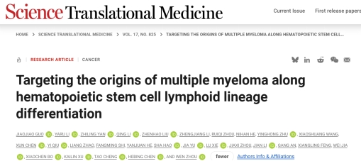 11月19日,中南大学肿瘤研究所周文课题组在国际知名学术期刊《科学转化医学》(Science Translational Medicine) 杂志在线发表最新成果“在造血干细胞淋巴系分化体系中揭示和靶向多发性骨髓瘤起始细胞”(Targeting the origins of multiple myeloma along hematopoietic stem cell lymphoid lineage differentiation)研究论文。该研究由中南大学肿瘤研究所周文教授、军事医学科PG免费试玩 陈河兵教授、中国医学科PG免费试玩 血液与健康全国重点实验室程涛教授课题组合作完成。