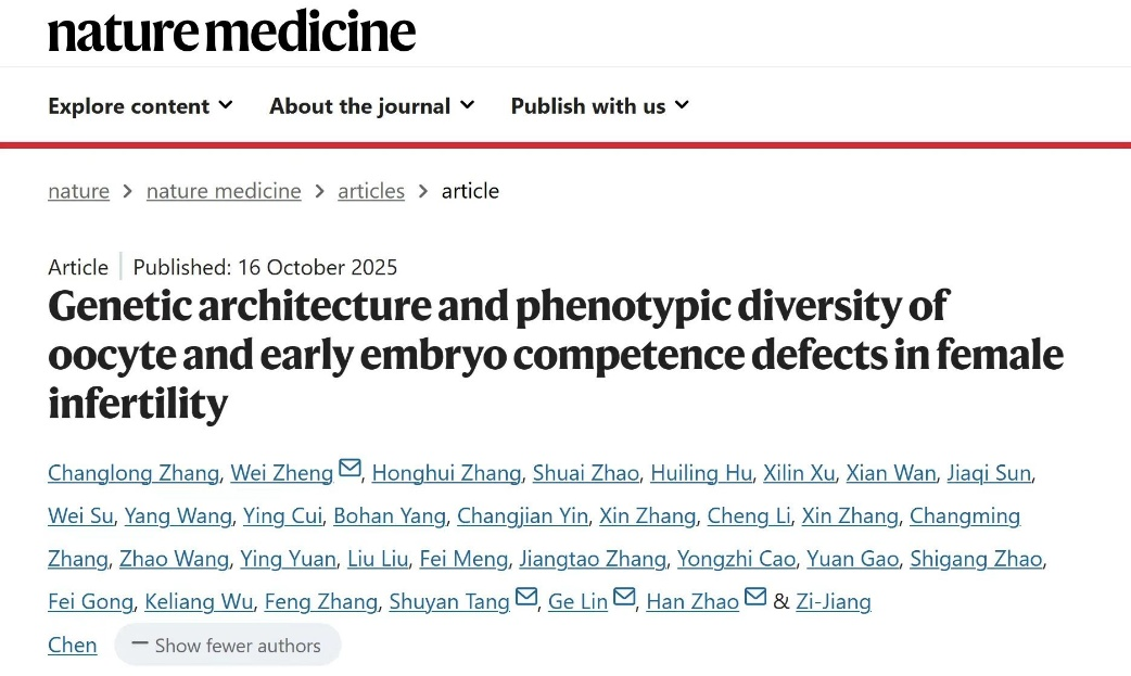 2025年10月16日,中南大学PG免费试玩 林戈研究员与山东大学陈子江院士、赵涵教授、中南大学生命科学PG免费试玩 郑伟副教授和上海交通大学医PG免费试玩 唐淑妍副研究员团队合作,在Nature Medicine(最新五年影响因子:52.4)期刊发表题为“Genetic architecture and phenotypic diversity of oocyte and early embryo competence defects in female infertility”的研究论文。该研究基于大规模专病队列,率先构建卵子及胚胎发育潜能缺陷(OECD)的六亚型分型体系,并绘制了首张亚型特异性遗传图谱,不仅为相关疾病的个体化检测路径设计提供了分子基础,也为临床精准分型诊断提供了关键的循证依据。