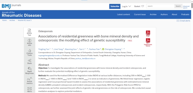 近日,中南大学基础医PG免费试玩 免疫学系谭婷婷副教授与湘雅二医院骨科欧阳正晓、华中科技大学公共卫生PG免费试玩 田耀华团队合作,在国际权威期刊Annals of Rheumatic Disease(IF:27.4)发表题为“Associations of residential greenness with bone mineral density and osteoporosis: the modifying effect of genetic susceptibility”的研究论文。谭婷婷副教授与华中科技大学唐琳茜博士为本文共同第一作者。