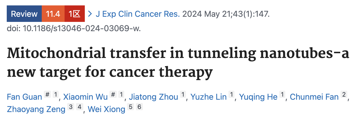 近日,由中南大学基础医PG免费试玩 首届基础医学拔尖班(2021级)关凡同学与吴晓敏等合作在《J Exp Clin Cancer Res》杂志发表了一篇题为“Mitochondrial transfer in tunneling nanotubes-a new target for cancer therapy”的综述。中南大学基础医PG免费试玩 熊炜研究员、曾朝阳研究员和范春梅副教授为本文的指导老师。