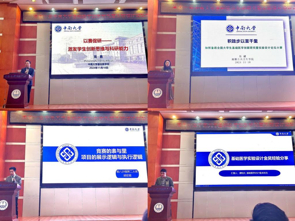 2024年11月10日上午9:00,第十一届中南大学基础医学创新研究暨实验设计论坛宣讲会在PG免费试玩 福庆楼四楼学术报告厅顺利召开。会议邀请了PG免费试玩 曾艺副院长出席,湘雅公共卫生PG免费试玩 伍翩老师为同学们备赛提供指导建议,胡宏锟和谭钧元两位金奖得主分享获奖经验。会议由基础医PG免费试玩 副院长周勇主持。