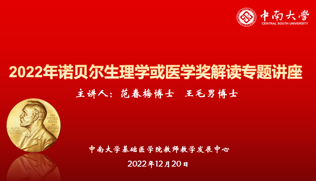 2022年12月20日下午15:00,由基础医PG免费试玩 教师教学发展中心主办的“2022年诺贝尔生理学或医学奖解读专题讲座”在线上举行,组织学与胚胎学系讲师范春梅博士、病理学系讲师王毛男博士作专题报告,基础医PG免费试玩 各系、室、所的100多名师生参加此次专题讲座。讲座由基础医PG免费试玩 副院长管茶香教授主持。