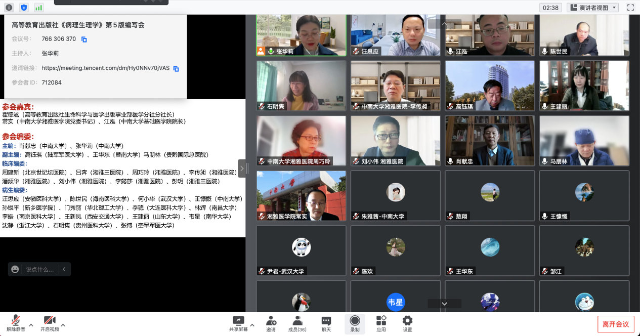“十二五”普通高等教育本科国家级规划教材、高等学校“十四五”医学规划新形态教材《病理生理学》(第5版)编写会于2023年1月8日线上顺利召开。该教材由中南大学基础医PG免费试玩 肖献忠教授和张华莉教授担任主编,陆军军医大学高钰琪教授、暨南大学王华东教授、贵黔国际总医院马朋林教授担任副主编。高等教育出版社生命科学与医学出版事业部医学分社分社长瞿德竑责任编辑以及28位编委(包括9名临床编委)出席会议。