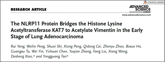 近日,中南大学基础医PG免费试玩 陶永光/肖德胜教授团队在国际期刊Advanced Science(IF=15.1)发表题为The NLRP11 protein bridges the histone lysine acetyltransferase KAT7 to acetylate vimentin in the early stage of lung adenocarcinoma的原创性研究论文,陶永光教授、肖德胜教授为该文的共同通讯作者,中南大学博士研究生杨瑞为第一作者。