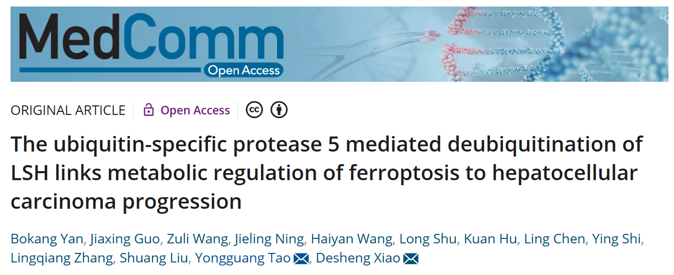 近日,中南大学基础医PG免费试玩 陶永光研究员与肖德胜教授团队在国际权威学术期刊《MedComm》(IF 9.9)在线发表题为“The USP5-mediated deubiquitination of LSH links metabolic regulation of ferroptosis to hepatocellular carcinoma progression(USP5介导LSH去泛素化修饰链接铁死亡的代谢调节与肝细胞肝癌进展)”的原创性研究论文。陶永光研究员、肖德胜教授为该文共同通讯作者,中南大学硕士研究生闫博康为第一作者。本研究受国家自然科学基金、湖南省重点研发计划和湖南省自然科学基金等项目支持。