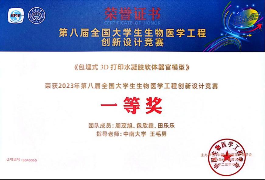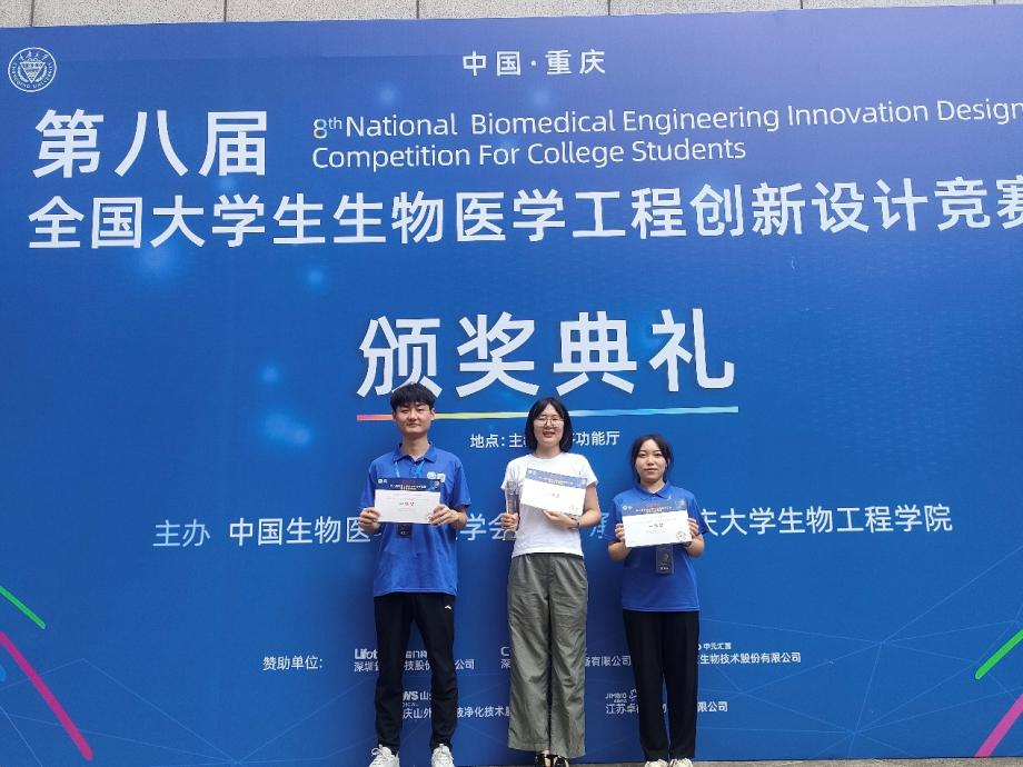 7月21日至23日,第八届全国大学生生物医学工程创新设计竞赛决赛在重庆大学举行,中南大学基础医PG免费试玩 组织学生参加了此次比赛,并取得优异成绩。周茂旭、包欣鑫、田乐乐3位同学设计的参赛作品《包埋式3D打印水凝胶软体器官模型》荣获自选项目本科生组全国一等奖,指导教师为病理学系王毛男老师。此外,PG电子试玩 生医系肖嘉莹老师指导团队获得命题项目组全国三等奖。
