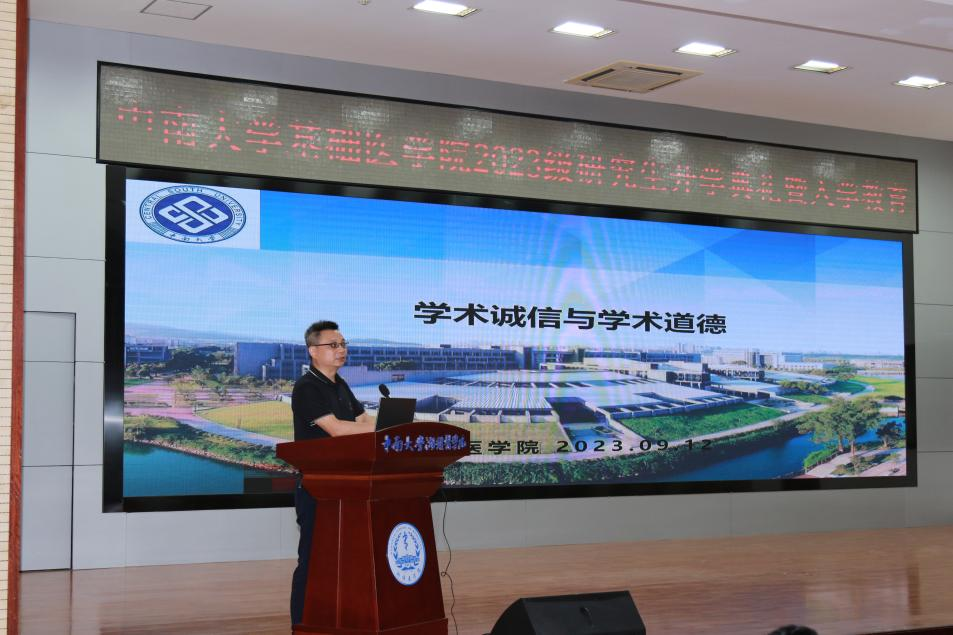 典礼结束后随即开展了新生入学教育。熊炜副院长进行研究生实验室安全教育,提出“实验室安全无小事”,要求研究生们一定要充分认识到实验室安全的重要性和必要性。王慷慨副院长开展学术诚信和学术道德教育,鼓励同学扎扎实实做研究,尊重事物的本质规律,以诚为本、恪守底线。学工办副主任胡名益强调了研究生日常安全,提醒同学们提升安全意识,守护健康安全底线。