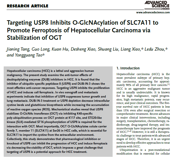 近日,中南大学基础医PG免费试玩 陶永光教授团队与湘雅医院周乐杜、肖亮教授肝脏外科团队在国际著名期刊《Advanced Science》以论著形式在线发表了题为“Targeting USP8 Inhibits O-GlcNAcylation of SLC7A11 to Promote Ferroptosis of Hepatocellular Carcinoma via Stabilization of OGT”(靶向USP8通过OGT抑制SLC7A11糖基化促进肝癌铁死亡)的原创性研究。陶永光教授、周乐杜教授、肖亮教授为本论文的共同通讯作者,中南大学湘雅医院肝脏外科博士后汤佳宁为论文第一作者。湘雅医院肿瘤科刘双教授、基础医PG免费试玩 /湘雅医院病理科肖德胜教授为该研究提供大力支持。