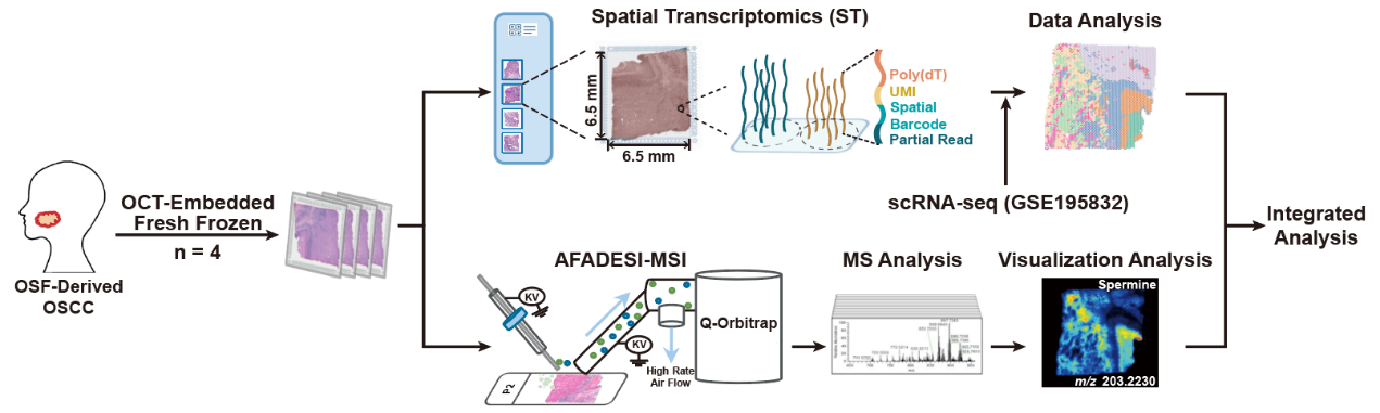 中南大学肿瘤研究所曾朝阳、熊炜及湘雅二医院口腔医学中心龚朝建团队,利用最先进的空间转录组和空间代谢组学平台,解析了槟榔相关口腔鳞癌发病新机制,相关论文“Spatial Transcriptomic and Metabolomic Landscapes of Oral Submucous Fibrosis-Derived Oral Squamous Cell Carcinoma and its Tumor Microenvironment(口腔黏膜下纤维化相关的口腔鳞癌及其肿瘤微环境的空间转录组及代谢组特征)”于2024年1月16日发表在Advanced Science(先进科学,影响因子:15.1)杂志。曾朝阳、熊炜、龚朝建为共同通讯作者,中南大学湘雅二医院硕士生郅远、字墨馨、肿瘤研究所博士生王倩为并列第一作者。该项目获得了国家自然科学基金区域创新发展联合基金重点资助项目、湖南省重大科技攻关“揭榜挂帅”项目和湖南省重点研发项目等资助。