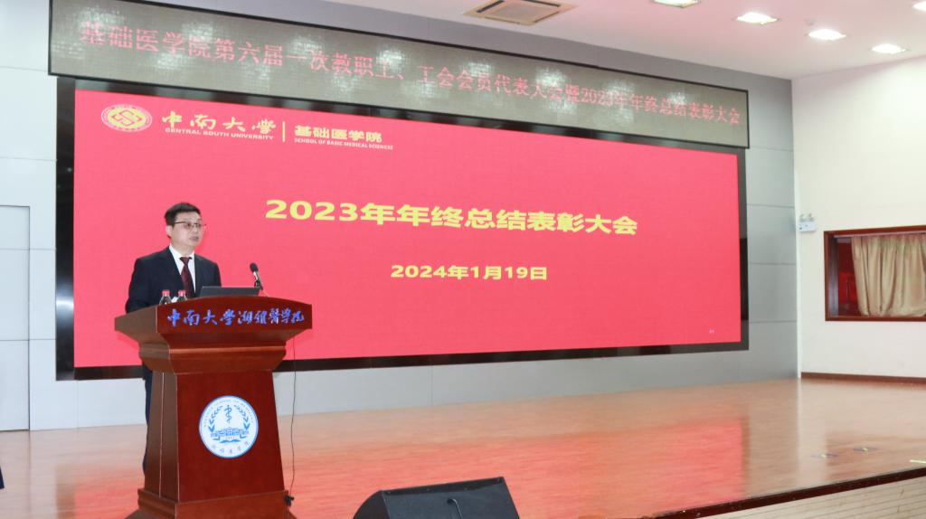 首先,院党委王慷慨书记代表PG免费试玩 致辞。他指出,举办简洁而庄重的总结表彰大会,既是为了总结成绩、表彰先进,也是锚定目标、鼓舞斗志。回望2023年,全院师生员工团结进取、凝心聚力,一起苦干实干推动PG免费试玩 高质量发展迈入新阶段。展望2024年,期望全体师生向着既定的目标奋跃而上、飞龙在天,赓续湘雅基础医学新辉煌。
