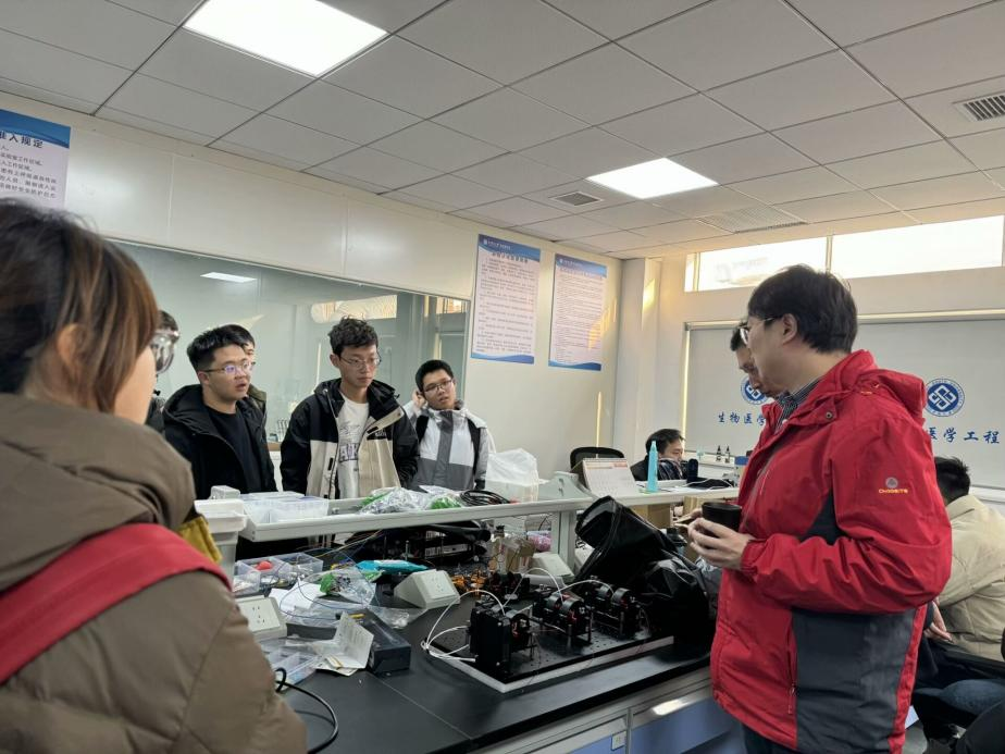 接着,在董竹新和尚艳杰老师的带领下,学生们前往基础医学拔尖基地进行参观学习。基地负责人首先介绍了实验室的整体情况,包括实验室的功能布局、实验设备以及近年来取得的科研成果。教授们深入浅出,将实验室的设施和基本运作原理介绍给学生们。学生们积极投入,对各种先进的实验设备和原理都产生了极大的兴趣,如高精度光谱仪、激光干涉仪、GPU算力服务器等,并现场观摩了力学和光学实验。前沿的科技开拓了学生们的视野,使学生们更广泛地了解生物科学领域的前沿,坚定了创新创业、创造新价值的决心。
