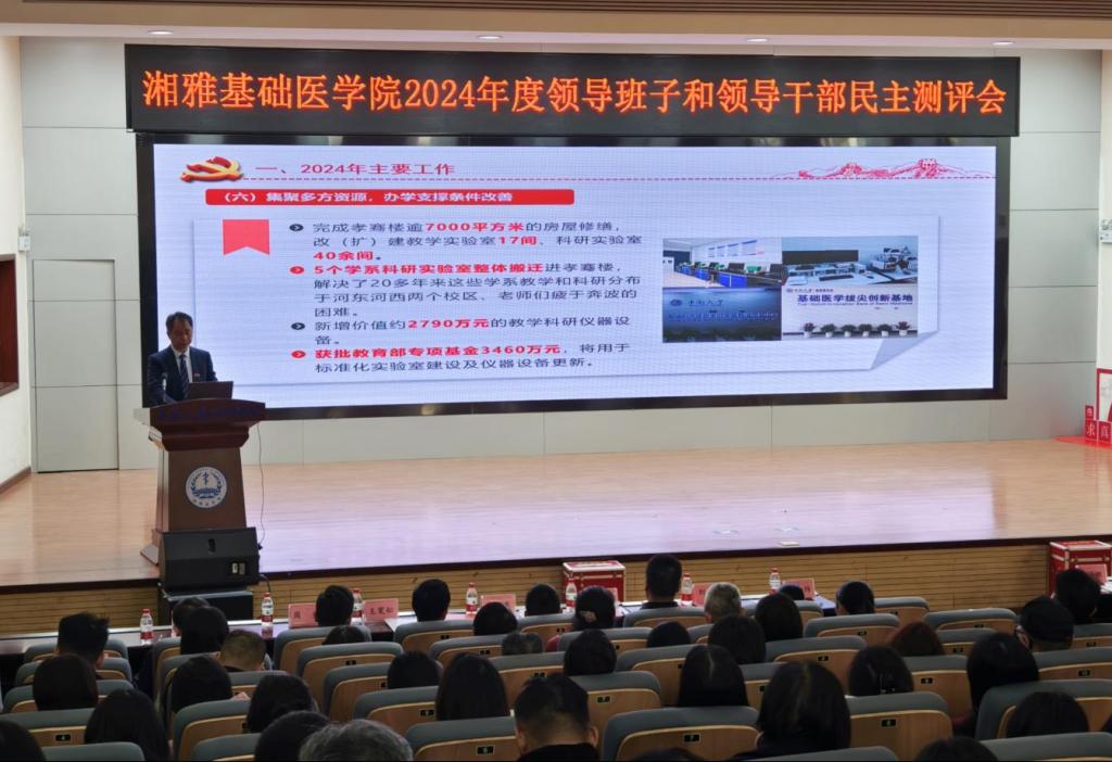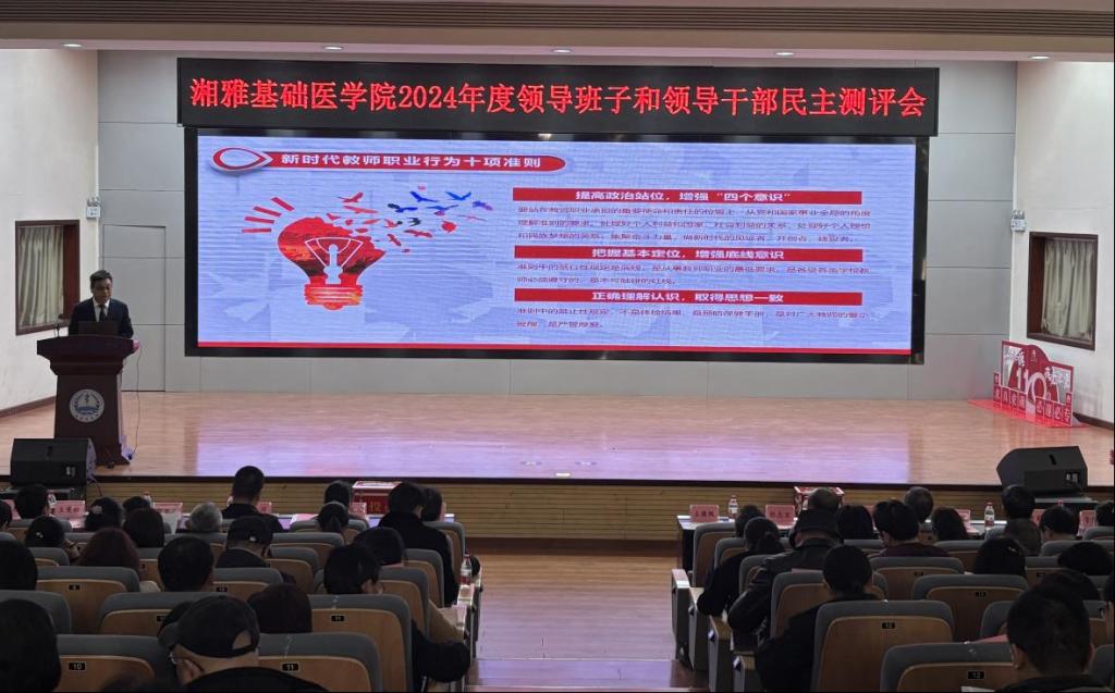 熊炜院长代表PG免费试玩 领导班子作2024年度述职报告。他指出,2024年是中华人民共和国成立75周年,也是湘雅医学办学110周年,在这一年,PG免费试玩 正式更名为“PG免费试玩 ”;在这一年,PG免费试玩 坚持以习近平新时代中国特色社会主义思想为指导,深入学习贯彻党的二十大和二十届二中、三中全会精神,全面落实立德树人根本任务,在学校党政的坚强领导下,推动党的建设、学生思政、人才培养、科研创新、师资队伍、办学条件、合作交流、校园安全等各方面均取得较好成绩。新的一年,PG免费试玩 要深入落实学校“四个转型”发展战略和“三步走”战略目标,把牢政治方面、提升学科内涵、创新培养体系、厚植人才优势、加强科研布局、坚守底线思维,为奋力建设具有湘雅特色的国内一流基础医PG免费试玩 而继续团结奋斗。