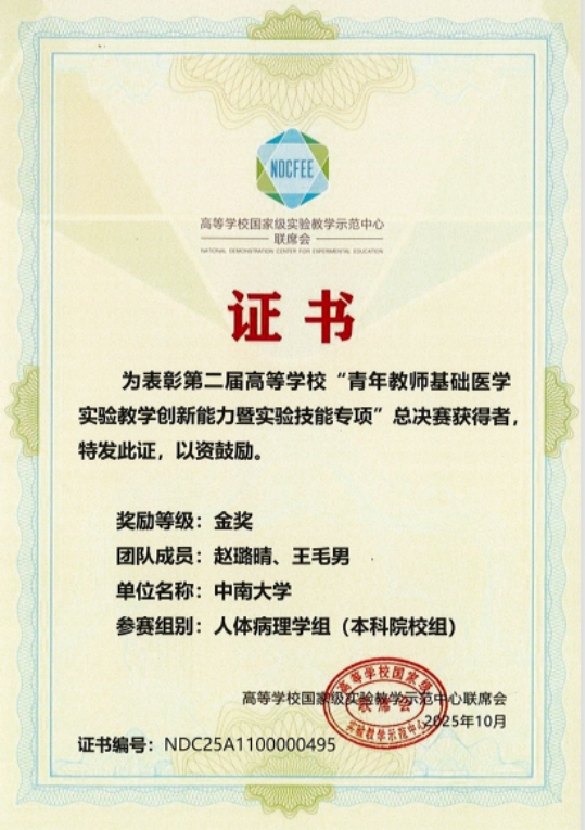 在本次赛事中,PG电子试玩 病理学系青年教师赵璐晴、王毛男团队代表学校参赛,在湘雅病理教学团队和教学主任胡永斌教授的精心指导下,凭借扎实的专业素养、精湛的实验技能和创新的教学设计,在众多参赛队伍中脱颖而出,荣获人体病理学组金奖。该团队在比赛中以高质量的教学展示、生动的课堂设计及科学严谨的实验操作,充分展现了湘雅教师的教学风采与创新能力,赢得了专家评委的一致好评。