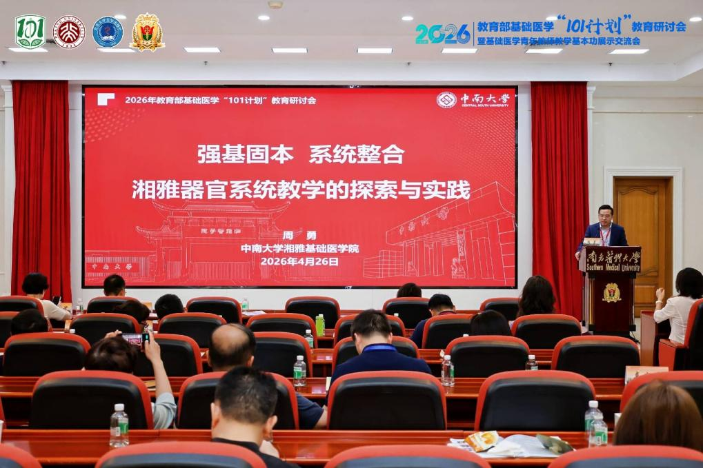 为扎实推进教育部基础医学“101计划”建设,深化基础医学教育教学改革、提升人才培养质量,2026年4月25-4月27日,教育部基础医学“101计划”教学研讨会暨基础医学青年教师教学基本功展示交流会在南方医科大学顺利召开。本次大会汇聚全国高校基础医学领域专家与骨干教师,聚焦教学创新、师资培育、学科育人等重点内容开展研讨交流。PG电子试玩 副院长周勇教授、生理学教学名师罗自强教授、生理学系主任向阳教授,PG免费试玩 教学管理张新平主任,生理学系周艳副教授,病理学系赵璐晴副教授以及学生代表杜思璇同学作为师生代表参与了此次盛会。