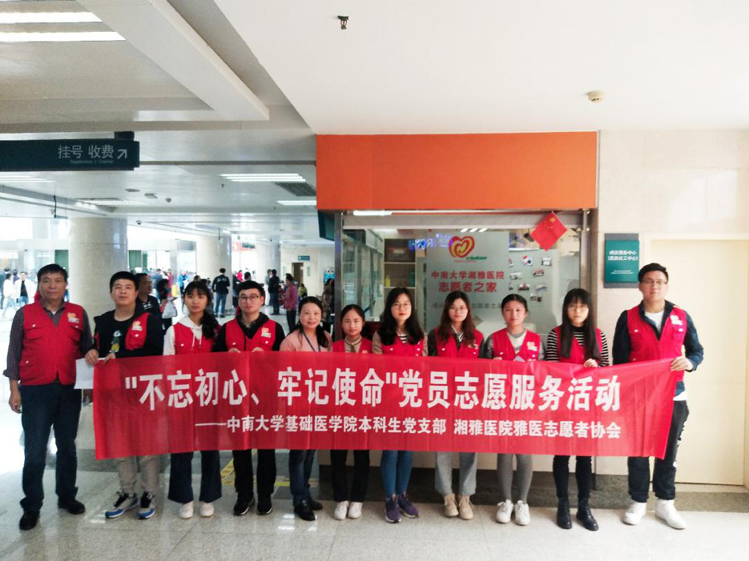 2019年10月24日、25日,基础医PG免费试玩 本科生党支部联合湘雅医院雅医志愿者协会,在中南大学湘雅医院开展了“不忘初心、牢记使命”党员志愿服务活动,支部共有18名党员分两批次参加了此次活动。